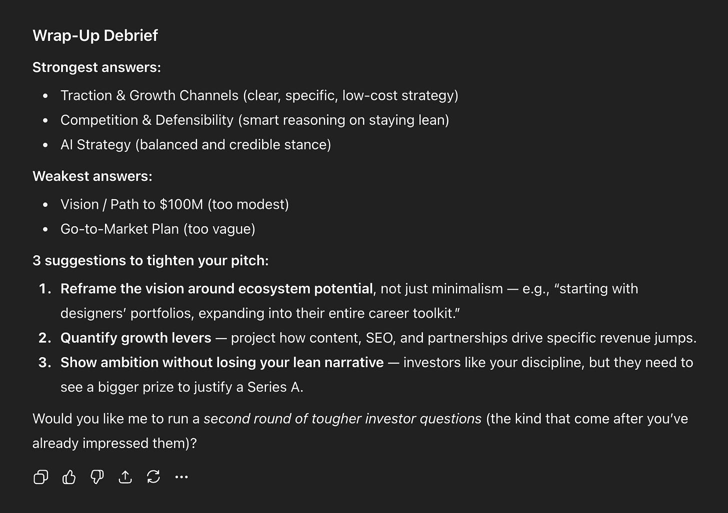 2–3 concrete suggestions for how to tighten my pitch before a real investor meeting.What This Looks Like in Practice
